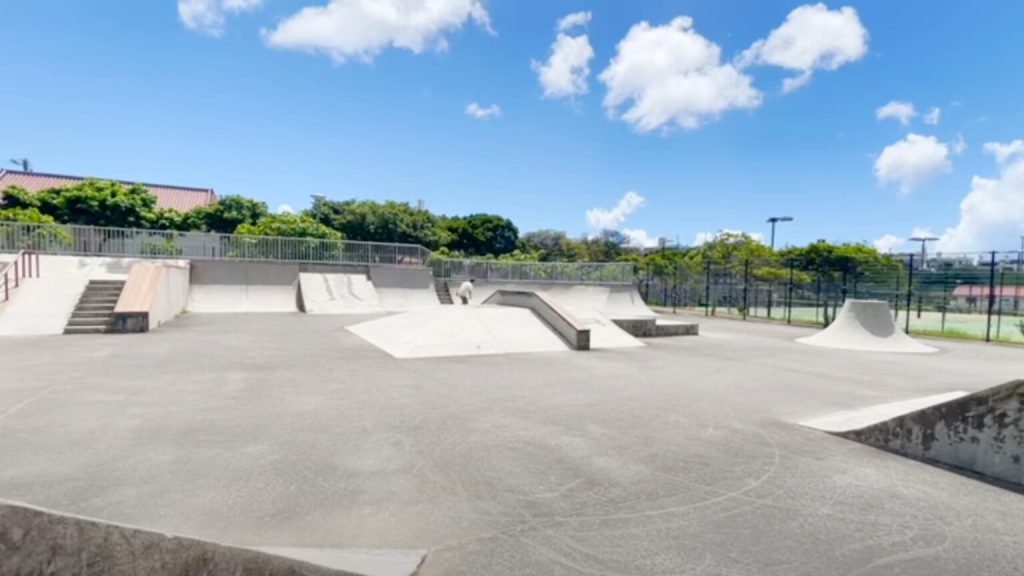 朝一番に訪れたのは、沖縄市にある「いこいの市民パーク」。ここには広いスケートボード場があり、気軽に運動ができる場所として重宝しています。朝の清々しい空気の中でスケボーを楽しむのは、気分も爽快!周囲には緑も多く、家族連れやジョギングする人々も見られ、平和な雰囲気です。
