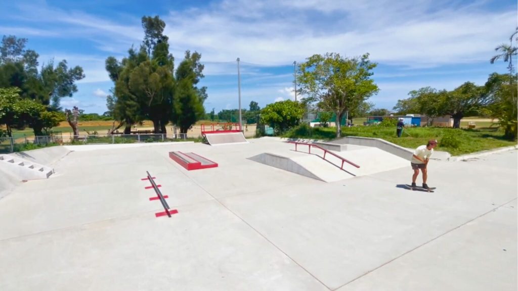 朝のスタートは、「宜野湾市民広場」でスケートボード。広々としたスペースがあり、朝の静かな時間帯には人も少なく、スケボーやジョギングを楽しむにはぴったりです。芝生エリアもあるため、のんびりと過ごしたい方にもおすすめの場所です。