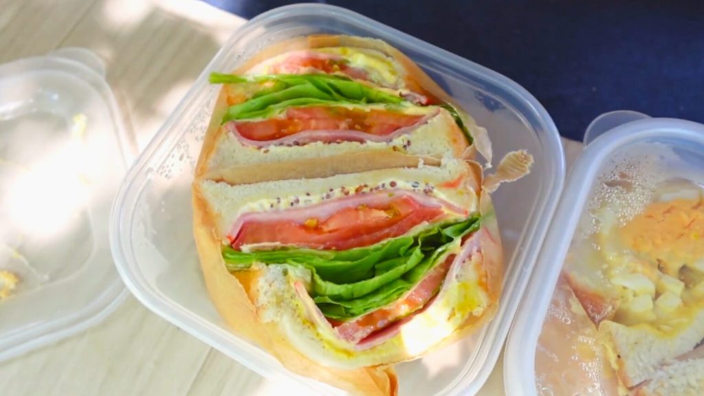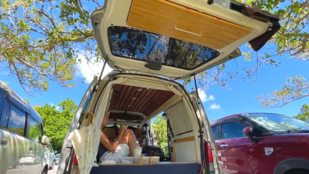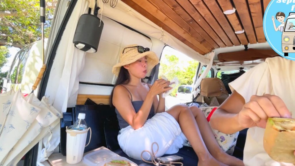 二ライビーチで海を満喫した後は、軽バンで車中飯タイム!たかと(旦那)の手作りサンドイッチをいただきました。車内での食事は移動の自由さも感じられ、ピクニック気分を味わえるため、沖縄の自然を背景にした食事が特別な時間になります。沖縄の風を感じながらの車中飯は最高でした!
